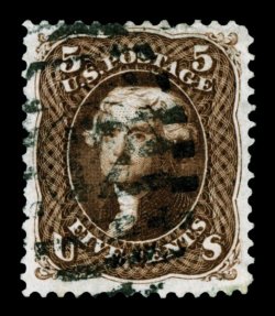 115 O 105 image#105, 5c Brown re-issue, a very rare used example of this re-issue, strong rich characteristic color and impression, well centered within large margins, light "12" in duplex cancel, light diagonal creases and a couple trivial tears at top, neither of which affect the stamp's very fine appearance; of the 672 sold, only a tiny fraction were used, and the majority of used examples have faults to some degree; 1991 PF certificate. (Image) $3,000.00