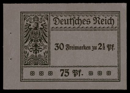 1201 BK Michel MH #6 imageMichel MH #6, 1916 75pf Germania complete exploded booklet with black on gray cover, made up of five panes of six of the 2 1/2pf Gray, booklet is complete with the five panes, four plain sheets of interleaving, both covers and the staple, mounted on a page for display, panes are well centered, some clipped perfs. at right in manufacturing, trace of hinging in the selvage, very fine; this value was issued to make up the 7 1/2pf rate with a 5pf value, however this booklet was very short lived being available for only a portion of the month of September 1916. (Image) Michel for n.h. €1,600