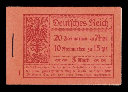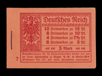 1202 BK Michel MH #7 imageMichel MH #7, 1916 3M Germania complete booklet with red on orange cover with numeral 1, containing three panes of six of the 7 1/2pf Orange, one pane of six of the 15pf Yellow brown (with Han no. H 3327.16), and a combination pane of two 7 1/2pf Orange and four 15pf Yellow brown values, panes separated by four sheets of interleaving with advertising or postal instructions, panes are overall well centered and fresh, o.g., n.h., a few slightly clipped perfs. in manufacturing as usual, covers are exceptionally fresh and clean, very fine and choice; an especially scarce complete booklet in this select condition. (Image) Michel €3,000