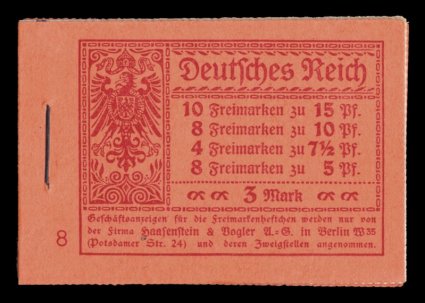1204 BK Michel MH #11 imageMichel MH #11, 1919 3M Germania complete booklet with red on orange cover with number 8, containing one pane of six of each of the 5pf Green (Han no. H1848.19), 10pf Red and 15pf Violet values, plus a combination pane of two 10 pf and four 15pf values, and another combination pane of two 5pf and four 7 1/2pf values, this is the later booklet produced in June and has the two values in the bottom left corner of the combination panes, panes separated by four sheets of interleaving with advertising or postal instructions, panes are exceptionally well centered and fresh with hardly any nibbed perfs., o.g., n.h., covers are also unusually fresh and attractive, an extremely fine booklet. (Image) Michel €750