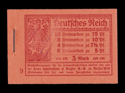 1203 BK Michel MH #10 imageMichel MH #10, 1919 3M Germania complete booklet with red on orange cover with number 7, containing one pane of six of each of the 5pf Green, 10pf Red and 15pf Violet values, plus a combination pane of two 10 pf and four 15pf values, and another combination pane of two 5pf and four 7 1/2pf values, this is the scarce earlier booklet produced in February with the two values in the bottom right corner of the combination panes, a similar and much more common booklet was produced in June and has the two values in the bottom left corner of the combination panes, panes separated by four sheets of interleaving with advertising or postal instructions, panes are well centered and fresh with only a few nibbed perfs. in manufacturing, o.g., n.h. though the 5pf pane has a small moisture spot on one stamp, covers are exceptionally fresh and clean, choice very fine and elusive booklet. (Image) Michel €3,500