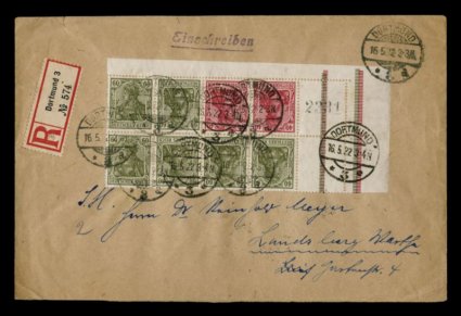 1206 c Michel #RL9, RL12 imageMichel #RL9, RL12, 1921 40pf Red carmine and 60pf Olive booklet pane multiples of two 40pf and six 60pf, taken from the bottom left corner of the sheet and including the scarce se-tenant positions of sheet margin line, label line and each of the values, also included in this multiple are two tete-beche pairs of the 60pf and a vertical 60pf and 40pf se-tenant pair (Michel #S25, F4), tied to 1922 registered cover to Landsberg by "Dortmund/16. 5. 22" c.d.s., backstamped, very fine; exceptionally scarce on cover with total catalog value for just the used se-tenant booklet multiples in Michel of €946. (Image) Est. 750-1,000