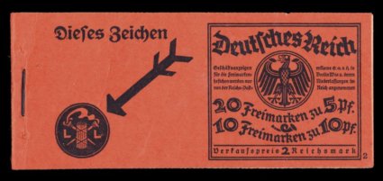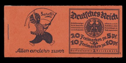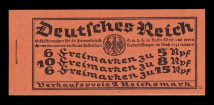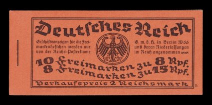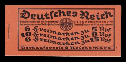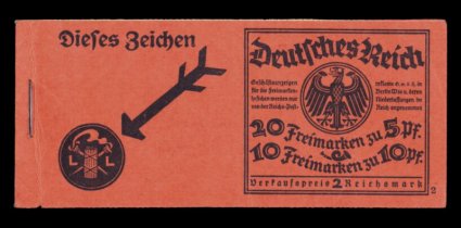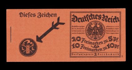 1208 BK Michel MH #16 imageMichel MH #16, 1925 2M New German Eagle complete booklet with black on pale red cover with numeral 2, containing two panes of ten of the 5pf Green and one pane of ten of the 10pf Orange red, contains three sheets of interleaving with Leipzig advertisements for life insurance, panes are well centered and fresh, o.g., n.h., some clipped perfs. in manufacturing as is quite normal on these large size booklets, covers are clean with only slight wear, very fine; an exceptionally scarce complete booklet. (Image) Michel €3,500