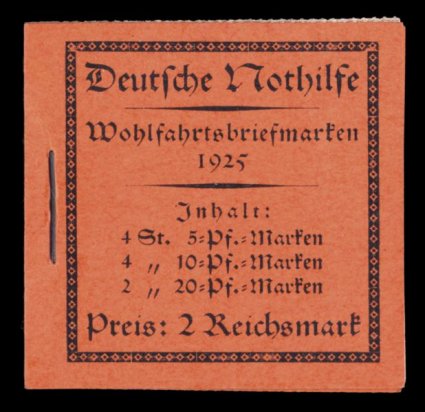1211 BK Michel MH #18c imageMichel MH #18c, 1925 2M Nothilfe complete booklet with black on pale red cover, the third and rarest type of booklet for this issue containing panes of four of the 5pf+5pf and 10pf+10pf, the 20pf+20pf is a pane of two stamps positioned horizontally in the center of the booklet, the selvage having an accounting number from the edge of the sheet, also contains two unprinted sheets of interleaving, panes are well centered and fresh with full unclipped perfs., o.g., n.h., covers are crisp and clean, very fine and a rare complete booklet. (Image) Michel €4,500