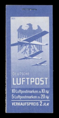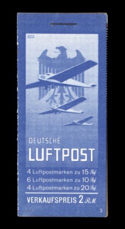 1212 BK Michel MH #19 imageMichel MH #19, 1930 2M Eagle Air Mail complete booklet with ultramarine cover, containing a pane of ten of the 10pf Red and a pane of five plus five X labels of the 20pf Dark gray blue, each pane followed by a sheet of interleaving with air mail information printed on it, stamps are fresh and well centered possessing full unclipped perfs., o.g., n.h., covers are crisp and attractive with only the faintest opening bend, very fine; an exceptionally scarce complete booklet with the first scarce configuration of the 20pf pane. (Image) Michel €1,500