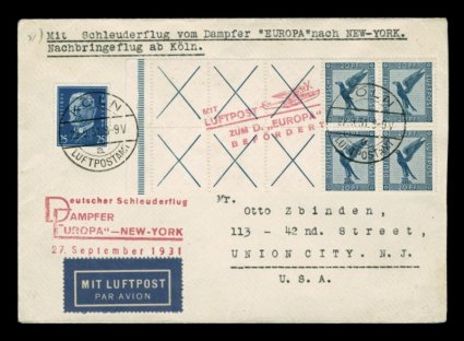 1214 c Michel H-Blatt #49 imageMichel H-Blatt #49, 193120pf Dark gray blue booklet pane of four with six X labels, with complete selvage and taken from a booklet shortly after issuance, tied to 1931 catapult flight cover of the Steamer "Europa" along with 25pf Blue by "Koln/Luftpostampt/22. 9. 31" c.d.s. and red flight cachet, a very fresh and handsome cover, extremely fine; while booklet pane multiples are frequently found, complete booklet panes on cover are very scarce. (Image) Est. 200-300