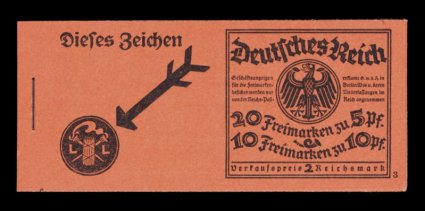 1207 BKS Michel MH #16S imageMichel MH #16S, 1925 2M Promotional Specimen complete booklet issued for the 1925 New German Eagle issue, being the first booklet issued after the currency reform, all aspects of the booklet are the same except for the panes themselves, including the same black on pale red cover with numeral 2 and the three sheets of interleaving with Leipzig advertisements for life insurance, however the panes do not have the stamp designs, rather on each stamp is 6.5mm numeral in the denomination and color of the issued stamp, two panes of ten of the "5" Green and one pane of ten of the "10" Orange red, each of the panes is well centered and fresh having full unclipped perforations all around, o.g., n.h., covers are clean with only minor wear, the front cover with some bends, mostly by the staple from opening, very fine. These promotional specimen booklets were produced as early as Michel MH #2, the Germania issues being issued without gum, the later issues with gum. The advertising whether on a label, cover or interleaving was complete as would be found on the issued booklet and apparently this was the purpose of the booklets as only ten to fifteen were sent to each advertising district, thus the number printed was very small. Furthermore they were not intended for public issuance and were supposed to be returned to the main Post Office Department in Berlin. There are twelve different booklets, such as this, that have been documented to be in collector's hands according to Michel. How many of each of these issues are available is not known, but of these twelve different, none of them ever appear on the market except in the rarest circumstances, so it is safe to assume that only two or three of each are known. This and the Hindenburg issue (see lot 1227) are the only examples we have ever seen in over 30 years. (Image) Est. 3,000-4,000