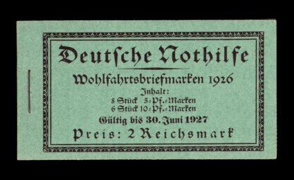 1218 BK Michel MH #23a imageMichel MH #23a, 1926 2M Nothilfe complete booklet with black on dark green cover, containing a pane of eight of the 5pf+5pf and a pane of six with two X labels of the 10pf+10pf semi-postals, an unprinted sheet of interleaving separates the two panes, stamps are well centered and fresh, perfs. slightly clipped at bottom, o.g., n.h., covers are crisp and clean, very fine. (Image) Michel €600