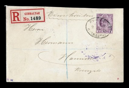 1262 c 56a image#56a, 1912 6p Violet and red violet on chalky paper, tied to neat single franking 1913 registered cover by "Registered/Gibraltar/2 MY 13" oval, registry label at left, posted to Hanover, Germany, Southhampton and London transits, backstamped, stamp has bright fresh colors and is extraordinarily well centered, extremely fine; an extremely rare stamp that saw little use on a particularly attractive cover (S.G. #70). (Image) Est. 500-750