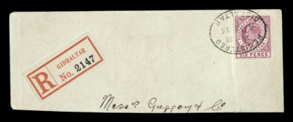 1263 O 56a image#56a, 1912 6p Violet and red violet on chalky paper, tied to a large part of registered cover by "Registered/Gibraltar/4 FE 13" oval, registry label at left, stamp has strong color and is well centered, very fine; catalog values are for a used stamp, this being a scarce late printing of the King Edward VII that was small in number and not much used; 1972 BPA certificate (S.G. #70; £375+). (Image) $450.00+