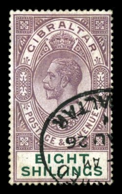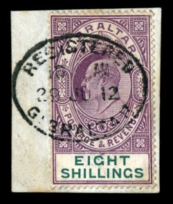 1265 O 63 image#63, 1911 8/- Violet and green, scarce high value tied to piece by full strike of "Registered/Gibraltar/29 JU 12" oval, rich colors, very fine (S.G. #74; £200). (Image) $225.00