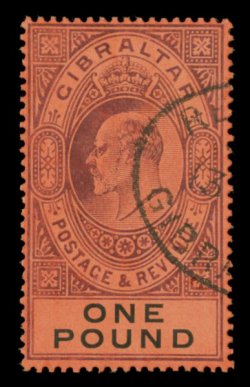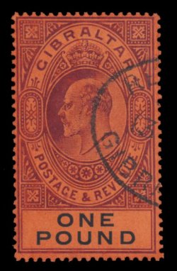 1270 O 92 image#92, 1927 £1 Orange and black, an especially attractive used single tied to piece by "Registered/Gibraltar/17 FE 23" oval that leaves the head cancel free, radiant color and fresh, very fine; quite uncommon nicely used (S.G. #107; £190). (Image) $210.00