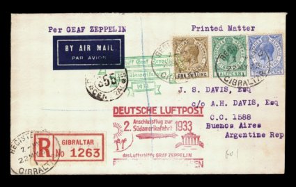 1268 c Sieger #214 imageSieger #214, 1933 Second South American flight of the Graf Zeppelin, flown registered cover with attractive franking of 1/2p Green, 3p Ultramarine and 1/- Brown olive and black (#76, 84a, 94) tied by Gibraltar registry cancels, green flight cachet and red Berlin connecting flight cachet, backstamped Buenos Aires, very fine; one of the earliest Zeppelin postings from this country. (Image) Est. 150-200