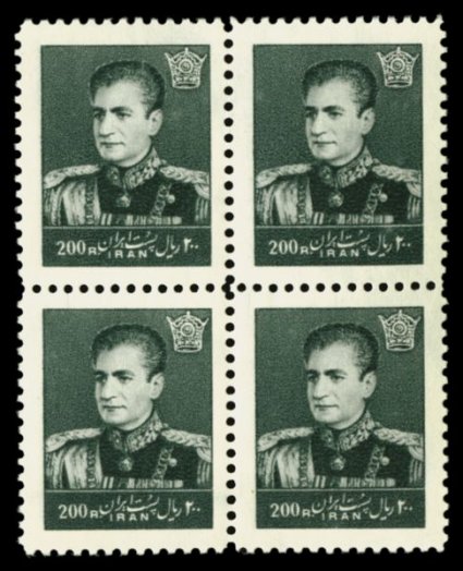 1277 nhbl 1107-25 image#1107-25, 1958-59 5d-200R Mohammad Reza Shah Pahlavi cplt. in mint blocks of four, fresh set, attractive colors, o.g., n.h., very fine-extremely fine. (Image) $884.00