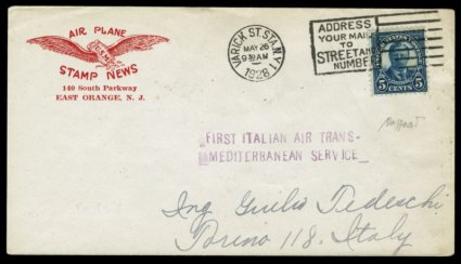 1278 c imageFirst Italian Air Trans-Mediterranean Service, two-line violet handstamp on Genoa-Turin flight of June 5, 1928, with appropriate postmarks and cachet on reverse, U.S. 5c Blue tied by Varick Station May 26, 1928 duplex cancel, Roessler corner card, very fine; a scarce first flight cover; signed Pat Herst. (Image) Est. 300-400