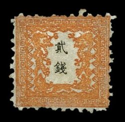1279 og 7a image#7a, 1872 2s Vermilion and black, on wove paper, plate II, position 22, an especially well centered mint single, radiant color and strong impression, o.g., h.r., light diagonal crease at top left, otherwise very fine and a terribly difficult stamp to find well centered (JSCA #7b; Y90,000). (Image) $400.00
