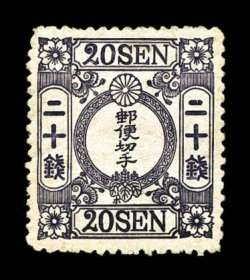 1280 og 38 var. image#38 var., 1874 20s Violet, syllabic 5, on foreign wove paper, striking mint single in an intense deep violet shade on bright white paper, strong detailed impression showing the the variety of tail missing from tenth curl in the left semi-circle (Woodward #1004, type 259D), marvelously well centered, full o.g., h.r., extremely fine and lovely example of this high value (JSCA #34; for normal Y60,000+). (Image) for normal $200.00