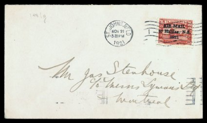 1301 c C3f/C8 image#C3f/C8, Small group of four air mail covers, includes two of the 1921 35c "Air Mail/to Halifax, N.S./1921" overprints on separate covers, both are the narrow spacing with 1 1/2mm between "Air" and "Mail", one with period after "1921" and the other without, also includes two 1958/59 registered covers to Switzerland with a complete set of 1931 air mails between them, very attractive and fine-very fine (S.G. #148f, 148g, 192-94); also includes two other late period covers, one with five values of the 1937 Coronation issues. (Image) Est. 300-400