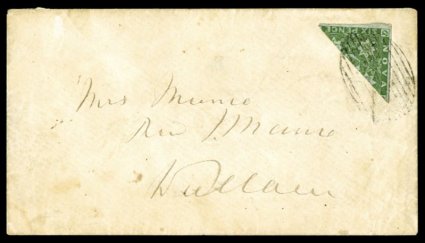 1305 c 4a image#4a, 1851 6p Yellow green, half used as 3p, diagonal bisect, an especially attractive example of this scarce usage, the bisect features remarkably bright fresh color, plus large margins, tied to 1860 cover to Wallam by mute oval grid cancel, large "Pictou/N.S./JU 21 1860" double-arc c.d.s. on the reverse having originated there, backstamped, trace of soiling to cover, in all other respects extremely fine; a highly desirable bisect usage; 2006 Greene Foundation certificate (Unitrade C$6,000.00). (Image) $3,750.00