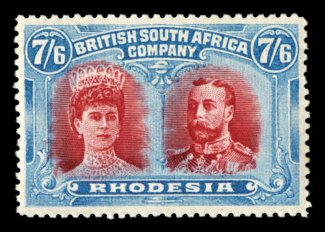 1307 og 116 image#116, 1910 7/6 Bright blue and carmine, exceptionally fresh mint single, bright colors, extraordinarily well centered, o.g., very lightly hinged, extremely fine (S.G. #160b; £600). (Image) $700.00