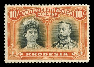 1308 og 117a image#117a, 1910 10/- Red orange and myrtle green (actually a fairly pure black with little or no green), well centered, deep luxuriant colors, o.g., lightly hinged, choice very fine (S.G. #163; £600). (Image) $700.00