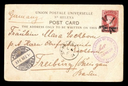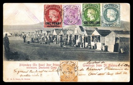 1318 c 35 image#35, 1887 1p on 6p Red, (small corner fault) tied to 1901 P.O.W. view card from Broad Bottom Camp by circular V's cancel, with matching "St. Helena/JU 1 01" c.d.s., violet Ty. 3 censor handstamp with initials AWP (unknown), card shows a panoramic view of the prison camp at Deadwood, posted to Germany with Freiburg receiving c.d.s., card with edge wear including a corner crease, fine and nice view of the camp (S.G. #37). (Image) Est. 150-200