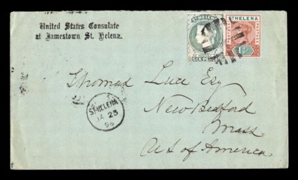 1313 c 7, 42 image#7, 62, 1887 6p Gray and 1890 1 1/2p Red brown and green, mixed issues franking making the 7 1/2p rate to the United States, tied to lovely 1896 United States Consulate cover by geometric V's cancel, "St. Helena/JA 23 96" c.d.s. at left, black "United States Consulate/at Jamestown, St. Helena" imprint at top, red London and black New York transits, backstamped New Bedford, Mass., exceptionally clean and attractive, very fine; an extremely rare usage out of the United States Consulate (S.G. #44, 48). (Image) Est. 750-1,000