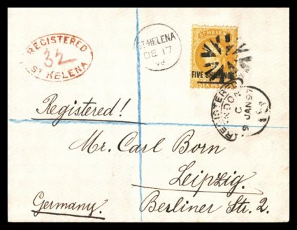 1314 c S.G. #20a imageS.G. #20a, 1868 5/- Yellow, single franking of this scarce shade on small 1898 registered cover to Leipzig, Germany, tied by circle of V's cancel and London registry transit, "St. Helena/DE 17 98" c.d.s. at left, red "Registered/St. Helena" handstamp with crayon "32", backstamped, clean and attractive, very fine and choice; certainly a philatelic usage but the only way this will be found on cover as a single franking; Stanley Gibbons for just the used stamp is £375 (Scott #24 var.). (Image) Est. 400-500