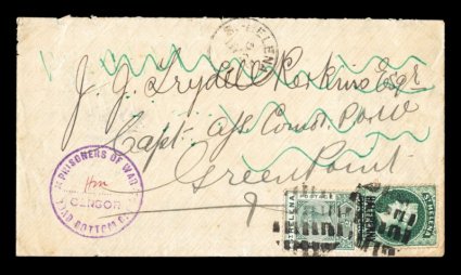 1315 c 34, 40 image#34, 40, 1894 1/2p on 6p Green and 1897 1/2p Green, tied to 1901 P.O.W. cover from Broad Bottom Camp by circular grid cancels, with matching "St. Helena/MY 25 01" c.d.s., nice strike of violet Ty. 3 censor handstamp with initials HM (H.G. Mortimer), posted to Greenpoint Camp in Cape Colony, backstamped Capetown, very fine and nice example of inter-camp mail (S.G. #36, 46). (Image) Est. 200-300