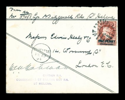 1316 c 35 image#35, 1887 1p on 6p Red, tied to magnificent 1894 soldier's letter to London by attractive geometric circle of V's cancel, "St. Helena/FE 19 94" small c.d.s. at left, endorsed at top by a corporal in the Royal Artillery, the predominant regiment based on the island, and countersigned by the commanding officer, extremely fine; an extraordinarily handsome and high quality example of this military usage (S.G. #37). (Image) Est. 750-1,000