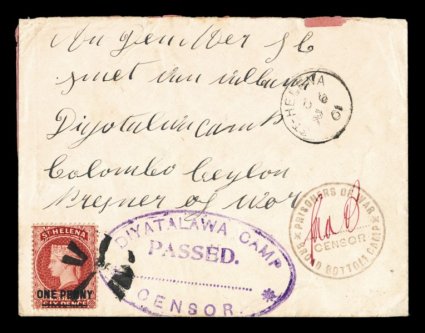 1317 c 35 image#35, 1887 1p on 6p Red, tied to 1901 P.O.W. inter-camp cover to Diyatalawa Camp in Ceylon from Broad Bottom Camp in St. Helena, stamp tied by circular V's cancel, with matching "St. Helena/JU 6 01" c.d.s. at right, violet Ty. 3 censor handstamp with initials GAdB (G.A. de Beer), also an excellent strike of the first type of the large oval censor h.s. of Diyatalawa, red censor tape, Colombo transit and Diyatalawa Camp backstamp on the reverse, very fine and a scarce prisoner of war cover between two camps (S.G. #37). (Image) Est. 400-500