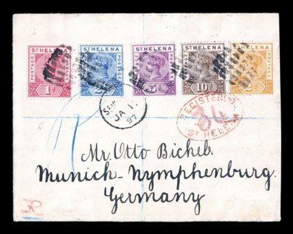 1319 c 41, 43-46 image#41, 43-46, 1896 1p-10p Queen Victoria cplt. for the five values that were issued in 1896, all neatly tied to an attractive 1897 registered cover to Germany by grid cancels, "St. Helena/JA 11 97" c.d.s. and red oval registry handstamp, backstamped Munich, very fine and nice early set cover (S.G. #47, 49-52). (Image) Est. 150-200