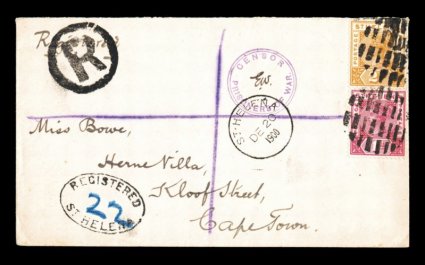 1320 c 41, 43 image#41, 43, 1996 1p Rose and 2p Yellow, tied to a very attractive registered 1900 P.O.W. cover from Deadwood Camp to Capetown by circular grid cancels, "St. Helena/DE 20 1900" c.d.s. at left along with clear violet Ty. I censor marking initialed "EW" (E. Walton), also has a nice oval "Registered/St. Helena" handstamp with blue crayon "22", backstamped, extremely fine; a pretty franking with all markings sharp and clear and much less common being registered (S.G. #47, 49). (Image) Est. 300-400