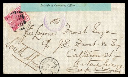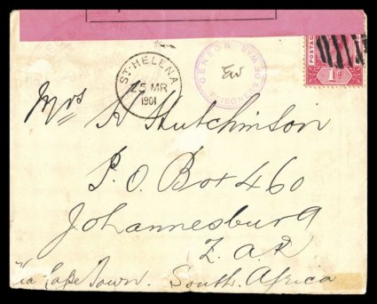 1322 c 41 image#41, 1896 1p Rose, tied to attractive 1901 P.O.W. cover to Uitenhage, Cape Colony, from Deadwood Camp with black straight line "Dead Wood Camp" cachet on the reverse, stamp tied by circular grid cancel with "St. Helena/MY 20 1901" c.d.s. at left below, violet Ty. I censor marking initialed "Cdns" (this censor apparently not known at this time), green British censor tape, backstamped with Uitenhage squared circle, light vertical fold, very fine (S.G. #47). (Image) Est. 200-300