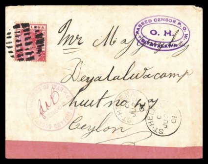 1323 c 41 image#41, 1896 1p Rose, tied to 1901 P.O.W. cover from Broad Bottom Camp by circular grid cancel with two strikes of matching "St. Helena/JU 22 01" c.d.s. at right, violet Ty. 3 censor handstamp with initials GAdB (G.A. de Beer), posted to Diyatalawa Camp in Ceylon with clear attractive strike of the second type of the small oval censor h.s. of Diyatalawa with printed initials "OH" in center, red censor tape, Colombo transit and Diyatalawa Camp backstamp on the reverse under tape, very fine and nice inter-camp usage (S.G. #47). (Image) Est. 200-300