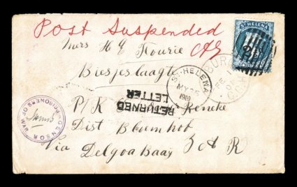 1324 c 47 image#47, 1893 "2 1/2d" surcharge on 6p Blue, tied to intriguing 1900 P.O.W. cover from Deadwood Camp by circular grid cancel, "St. Helena/MY 26 1900" c.d.s. at left, an early usage out of this camp as the first prisoners did not arrive until April of 1900, violet Ty. I censor marking initialed "JHMB" (J. Henry Mountifort Beasley), posted to Schweizer Renke, Z.A.R, this town was besieged by the Boers from August 1900 to January 1901 and mail was interrupted both during and prior to the siege, ms. "Post Suspended" and initialed plus "Returned/Letter" handstamp, various transits including red "Returned Letter Office/Capetown/FE 8 1901" c.d.s. on the reverse, very fine; a scarce prisoner-of-war cover showing the turmoil in South Africa (S.G. #40). (Image) Est. 500-750