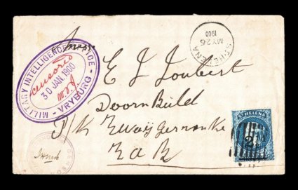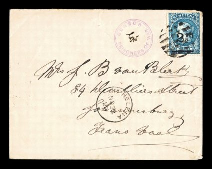 1325 c 47 image#47, 1893 "2 1/2d" surcharge on 6p Blue, tied to neat 1900 P.O.W. cover from Deadwood Camp by circular grid cancel, matching "St. Helena/MY 26 1900" c.d.s. above, plus violet Ty. I censor marking initialed "JHMB" (J.Henry Mountifort Beasley), posted to Doorn Buld, Z.A.R. backstamped on June 5th in Capetown, then a rare "Military Intelligence Office/Vryburg /30 Jan. 1900" (not changed to 1901 in error) oval handstamp was applied nine months later with red ms. "Censored" and initials, very fine and scarce cover (S.G. #40). (Image) Est. 400-500