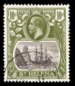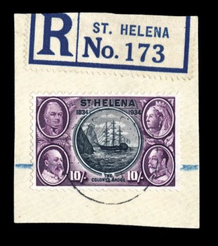1327 O 60 image#60, 1908 10/- Green and red on green, extraordinarily choice used example, beautifully centered, neatly cancelled by centrally struck "St. Helena/MY 19 11" c.d.s., extremely fine in all respects (S.G. 71; £250). (Image) $300.00