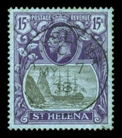 1331 O 94 image#94, 1922 15/- Violet and black on blue Badge of the Colony, a marvelously well centered single of this elusive high value, also possessing deep rich colors, plus a neat central c.d.s. postmark, extremely fine; a value that is much rarer used than mint; (S.G. #113; £1,500). (Image) $1,875.00