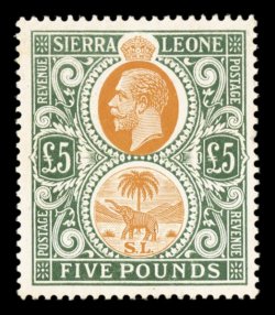 1339 og 139 image#139, 1921 £5 Gray green and orange, wonderfully bright colors and crisp impressions on fresh white paper, very well centered, full clean o.g., lightly hinged, there is just a faint scrape of the chalky surface paper on one perforation at right, otherwise a very fine and handsome example of this scarce high value (S.G. #148; £1,300). (Image) $1,300.00
