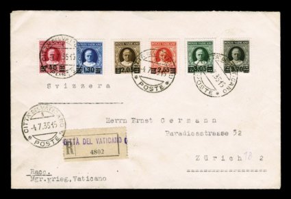 1340 c 35-40 image#35-40, 1934 40c-3.70 Surcharges cplt., fresh set of these scarce provisionals, bright colors and full intact perforations, tied to registered cover to Switzerland by "Citta del Vaticano/Poste/4. 7. 35" c.d.s., backstamped Zurich, very fine and scarce full set cover. (Image) Est. 750-1,000