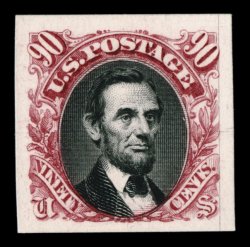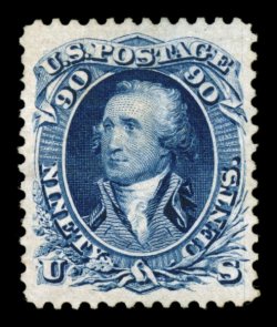 121 ng 111 image#111, 90c Blue re-issue, unused, incredibly well centered within large margins, deeply rich color and a strong detailed impression, two faint creases and a small thin spot at left, extremely fine appearance; despite the minor flaws, this is a highly desirable example of this rare re-issue high value, as this is one of the finest centered of the 317 sold; 2006 PF certificate. (Image) $4,150.00