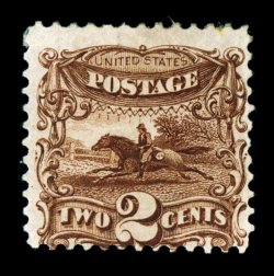 126 og 113b image#113b, 2c Brown, without grill, a sound mint example of a truly rare and seldom offered variety, deep rich color in a dark brown shade, disturbed o.g., h.r., fine; the lower denomination without grill varieties are seen with far less frequency than the higher values; 2005 PSE certificate. (Image) $2,750.00