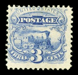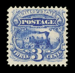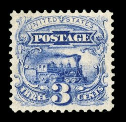128 ogu 114 image#114, 3c Ultramarine, fresh mint single, attractive rich color in a dark ultramarine shade and a crisp detailed impression on bright white paper, full clean o.g., barest trace of hinging, very fine; photocopy of a 1980 PF certificate for a block of four and 2005 PSE certificate (VF 80; SMQ $330.00). (Image) $350.00