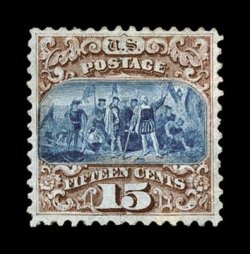 136 ng 118 image#118, 15c Brown and blue, Ty. I, a very scarce unused example, strong colors, fairly well centered, regummed, fine; 1991 PSE certificate. (Image) $4,250.00