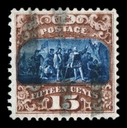 141 O 119 var. image#119 var., 15c Dark brown and blue, Ty. II, used, unusually well centered, deep intense colors in the dark brown and blue shade, wide bar grilled cancel, extremely fine; 2006 PF certificate specifying the shade variety. (Image) $275.00