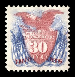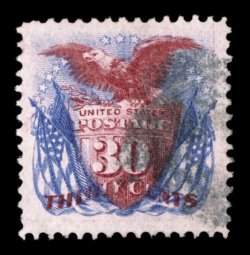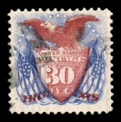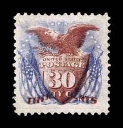 146 Ou 121 image#121, 30c Blue and carmine, an especially handsome and striking used single, possessing extraordinarily large margins all around and being marvelously well centered within them, rich vibrant colors and crisp detailed impressions, light cork cancel, extremely fine; 2005 PF certificate and a 2005 PSE certificate (XF 90 Jumbo; SMQ $1,150.00 for 90, $2,200.00 for 95). (Image) $550.00
