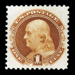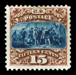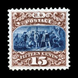 156 ng 129 image#129, 15c Brown and blue re-issue, Ty. III, a gem unused example that possesses absolutely perfect centering amid extravagantly large margins, gorgeous intense colors and prooflike impressions on brilliantly fresh paper, extremely fine; a stamp with tremendous eye appeal; only 1,981 sold; 1992 PF certificate. (Image) $1,050.00