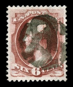 165 O 137 image#137, 6c Carmine with grill, especially well centered within large margins, strong rich color, interesting fancy cork cancel, certificate notes a strengthened perf. at right which is quite trivial, otherwise extremely fine; 1987 PF certificate. (Image) $525.00