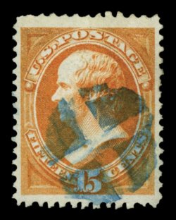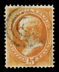 174 O 152 image#152, 15c Bright orange, impressive used example, featuring huge oversized margins and being exceptionally well centered within them, absolutely radiant and intense color on bright paper, central blue quartered cork cancel, extremely fine and quite striking; 1993 PF and 2005 PSE certificates. (Image) $200.00